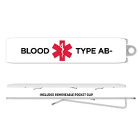 The Blood Type Medical Alert Clip is a medical ID that uses a Faceplate attached to an Anywhere Pocket Clip to convey what blood type the owner has: A+, A-, B+, B-, AB+, AB-, O+, or O-.